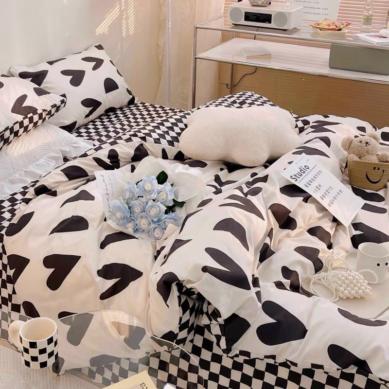 Bộ chăn ga gối Cotton poly M2T bedding gồm vỏ chăn mền, drap ga giường và 2 vỏ gối nằm - PL Tim khuyết đen