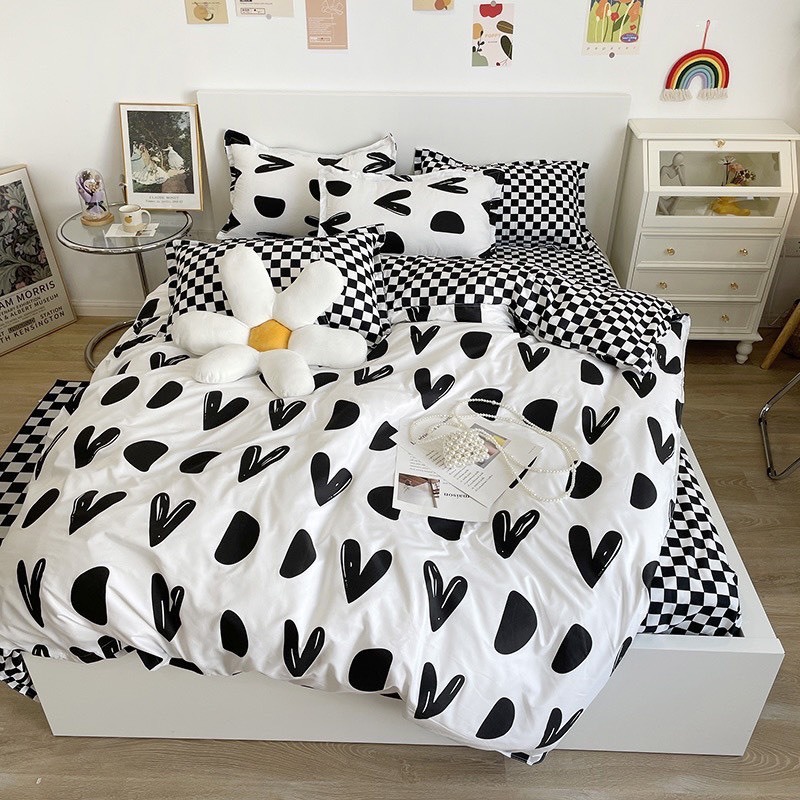 Đặt mua Bộ chăn ga gối Cotton poly M2T bedding gồm vỏ chăn mền, drap ga giường và 2 vỏ gối nằm - PL Tim khuyết đen